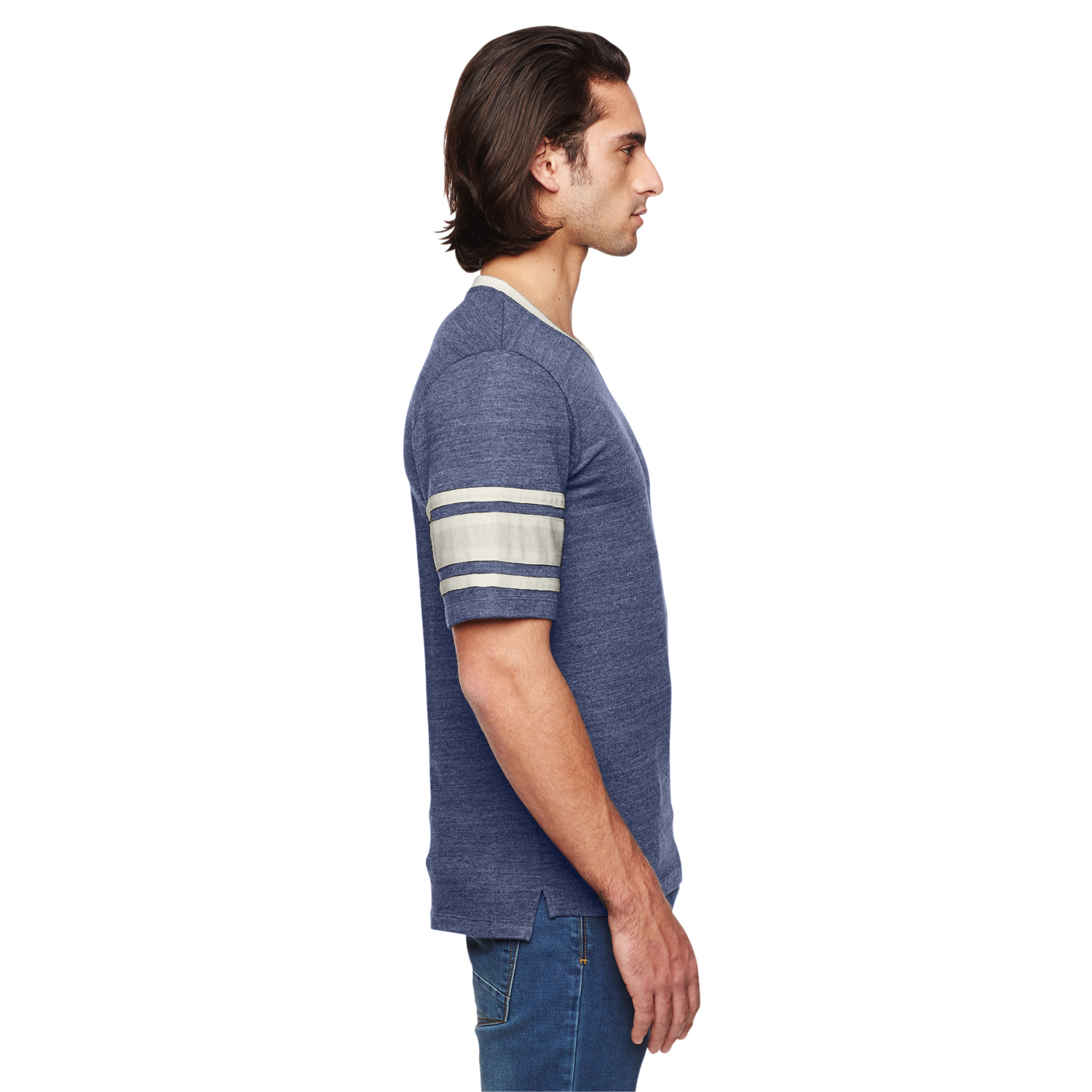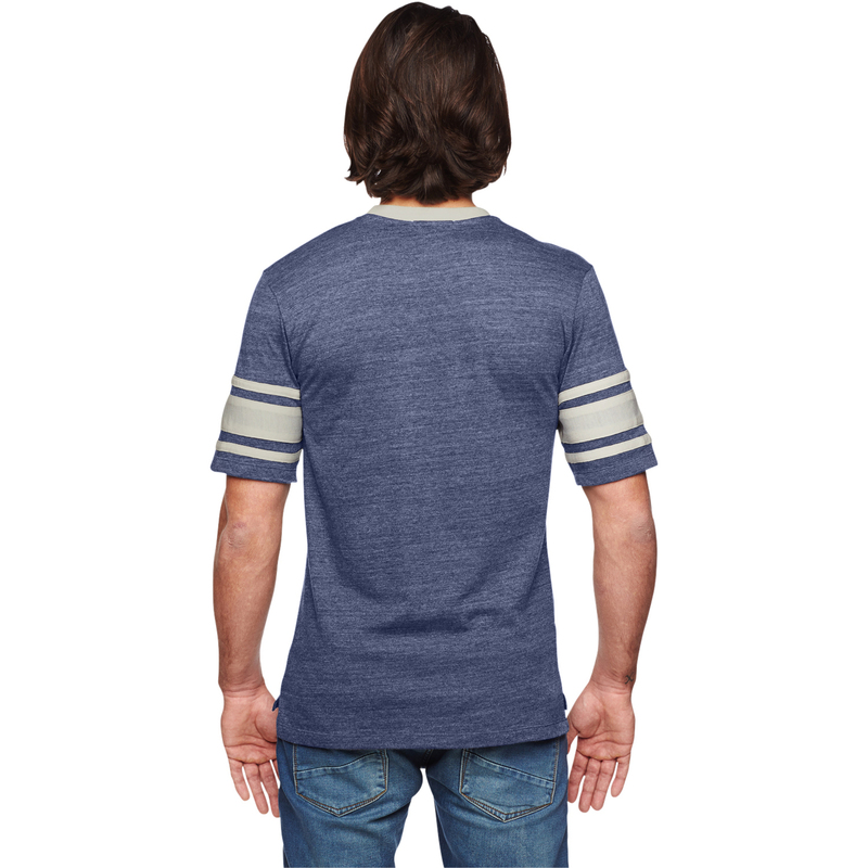 20's 50% polyester (6.25% recycled), 38% cotton (6.25% organic), 12% rayon; 4.13 oz.; Men's classic fit; Contrasting neckband and matching sleeve stripes; High-low hemline;