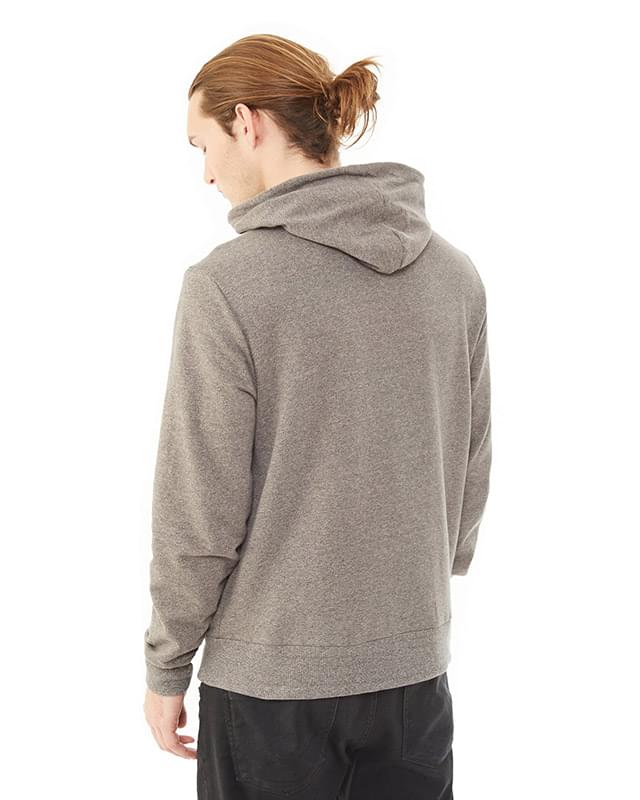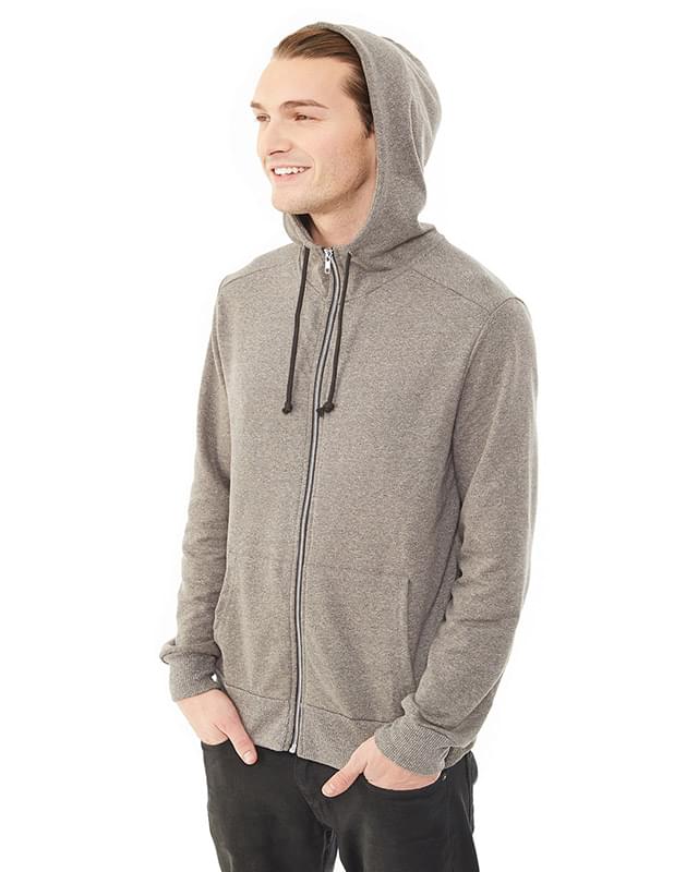 50% cotton, 50% recycled polyester eco-mock twist French terry; 6.34 oz.; men's classic fit; fabric-washed; antique nickel zipper and eyelets; adjustable drawstring and set-in sleeves; eco-mock twist French terry; split pouch pockets; 2x1 ribbed cuffs and bottom band;