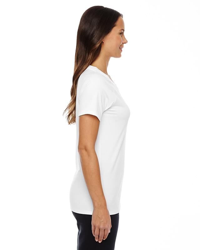 100% polyester; UA tech fabric with an ultra-soft, natural feel for unrivaled comfort; signature Moisture Transport System wicks sweat away from the body; anti-odor technology prevents the growth of odor-causing microbes; raglan sleeve construction and flatlock stitching allow a full range of motion without chafing; ladies' loose fit; UA logo on top front chest and back neck (back neck logo is tonal on the white);