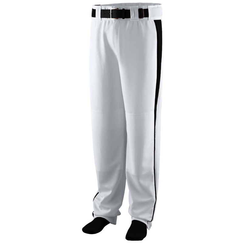 14-ounce 100% polyester double knit; Relaxed fit- full cut with longer inseam and double needle hemmed open bottom; Anti-roll elastic waistband with seven pro-style belt loops; Two-snap closure; Brass zipper fly; Two set-in double welt back pockets; Reinforced knees and coverstitching at back seam; Contrast color side inserts and piping; 35-inch inseam on Adult large with graded inseam;