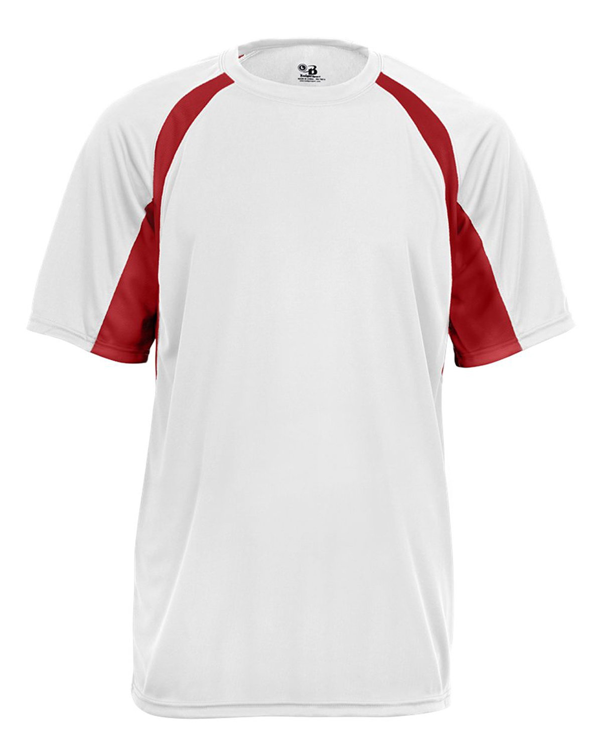 Moisture management/antimicrobial performance fabric; Self-fabric collar; Contrast side and sleeve panel inserts; Double-needle bottom hem; Heat seal logo on left sleeve;