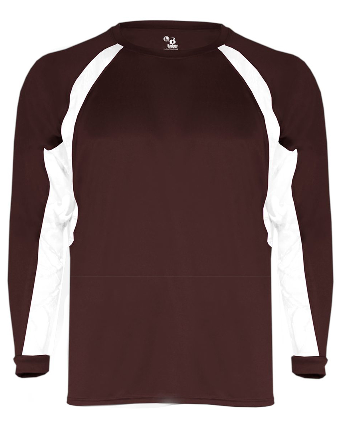 Moisture management/antimicrobial performance fabric; Self-fabric collar; Contrast side and sleeve panel inserts; Double-needle bottom hem; Heat seal logo on left sleeve;