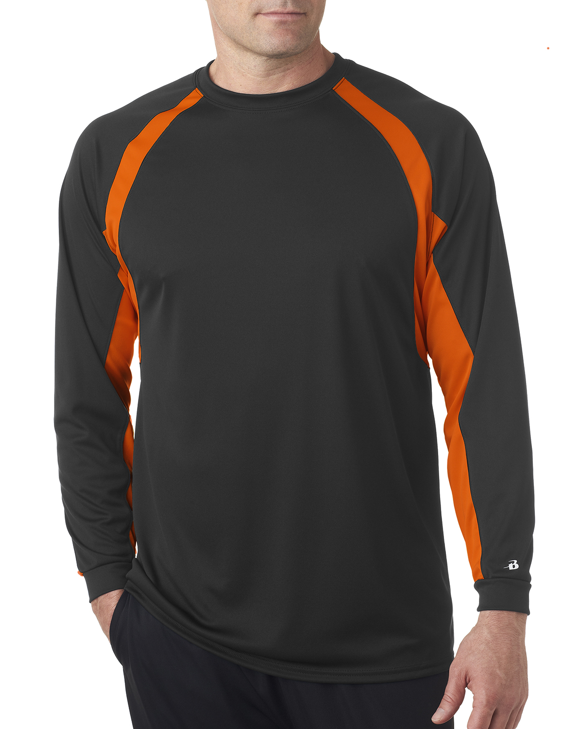 Moisture management/antimicrobial performance fabric; Self-fabric collar; Contrast side and sleeve panel inserts; Double-needle bottom hem; Heat seal logo on left sleeve;