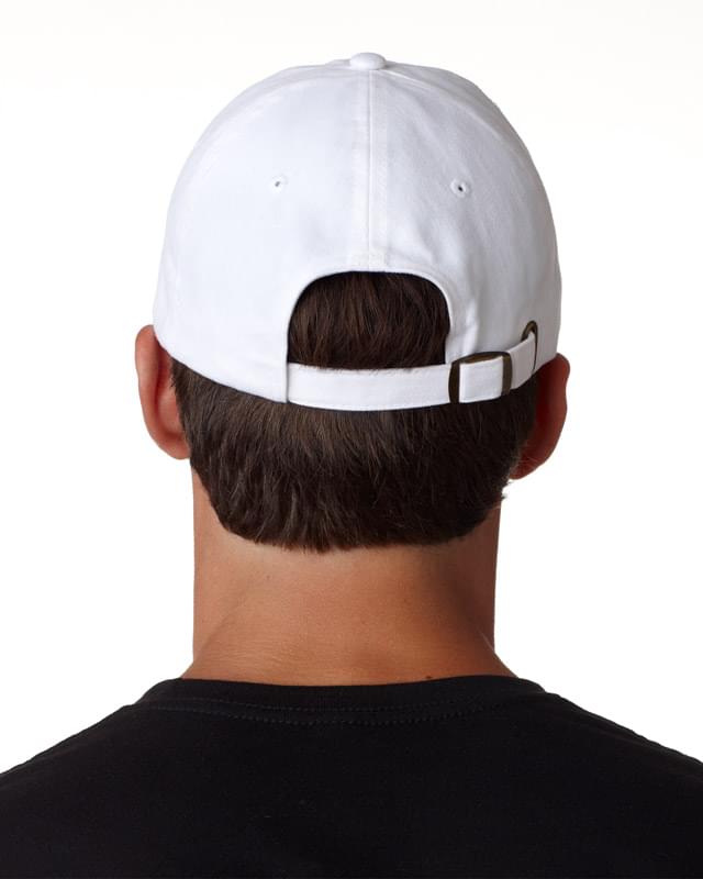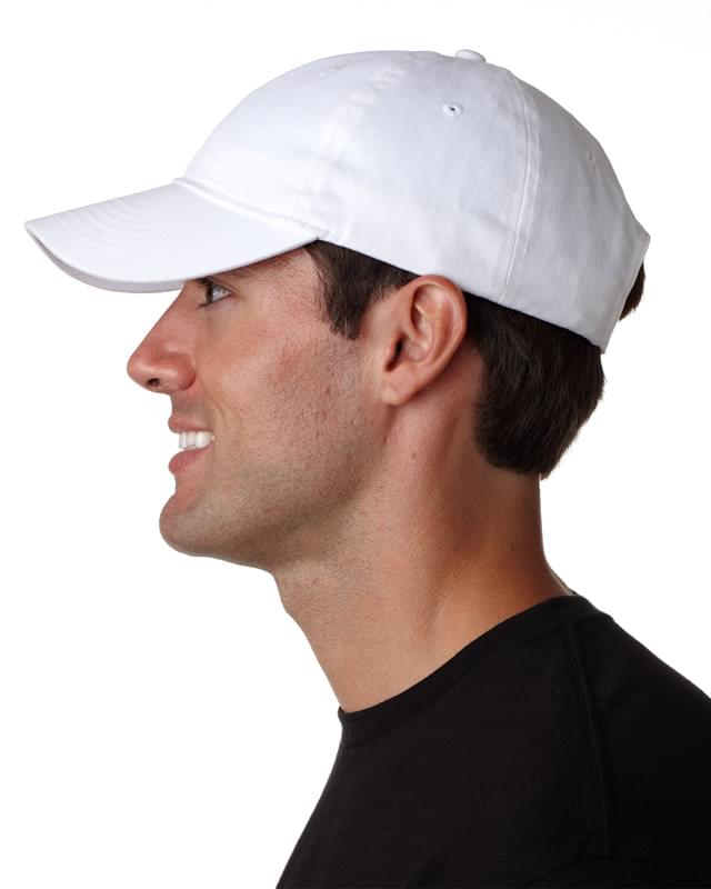 100% cotton; Low-profile; 6-panel; Pre-curved visor; Triple-stitched sweatband; Adjustable self-fabric strap closure with brass snap-buckle; 4"w x 2 1/2"h imprint area;