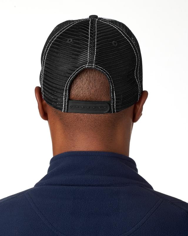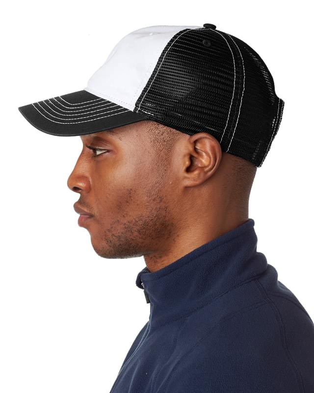 100% cotton; 100% polyester mesh back; Low-profile; 6-panel; Pre-curved visor; Soft mesh back; Contrast stitching; Adjustable closure; 4"w x 2 1/2"h imprint area;