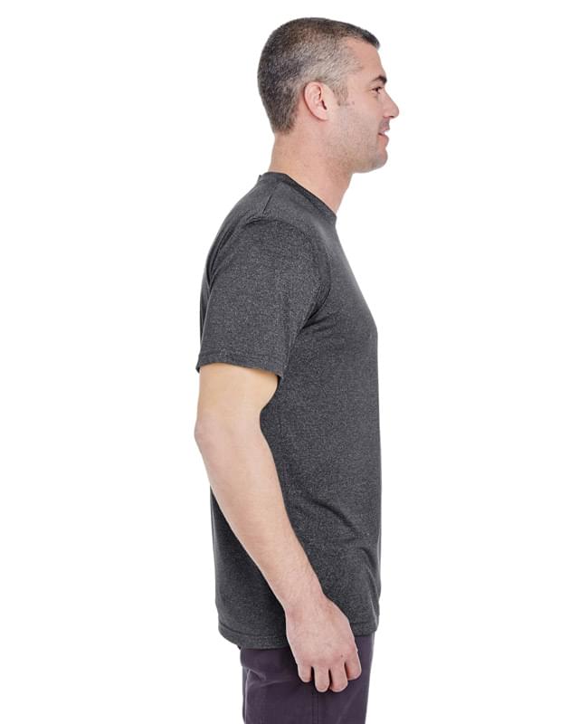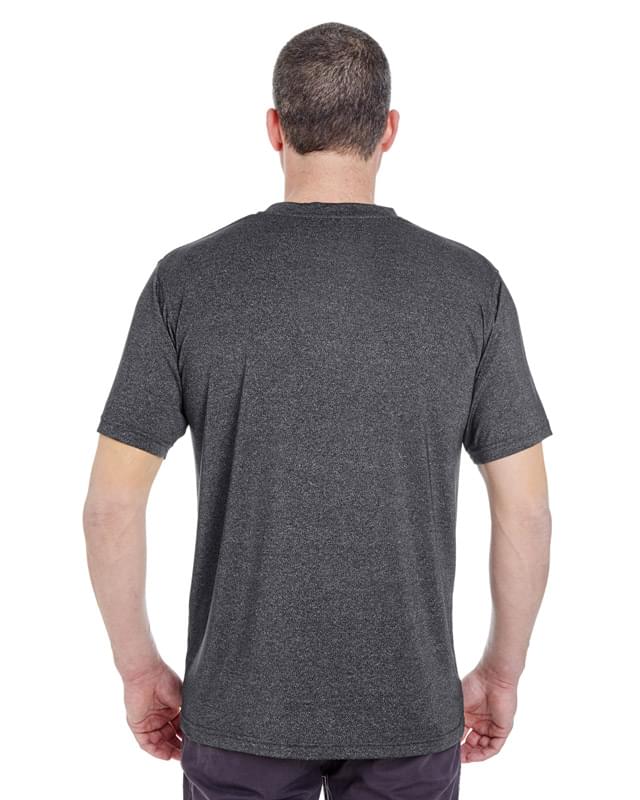 4 oz., 100% heathered polyester; Moisture-wicking; Snag-resistant; UV protection; Relaxed fit;