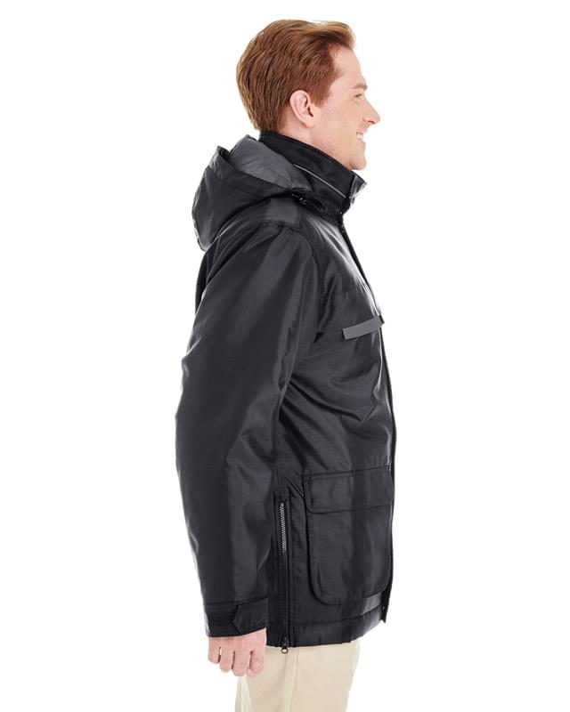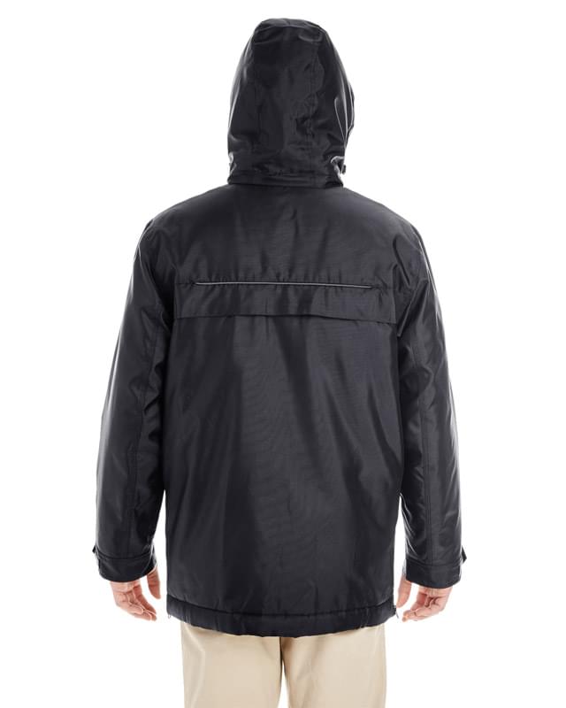 Contrast: 100% polyester brushed tricot in body; 100% polyester taffeta in sleeves and hood; Insulation: 140 gsm thermal poly fill in body and hood; 80 gsm thermal poly fill in sleeves; Body: 4.3 oz., 100% polyester oxford with water-resistant finish; Zip-off hood; Reflective piping at collar and back yoke; Center front vislon zipper with autolock slider; Concealed chest pockets with retractable reflective details; Adjustable cuffs with tabs; Lower patch pockets; Storm flap with hidden metal snaps; EZ-AWAY removable ID panel; Sideseasm vision zippers fpr easy equipment access;
