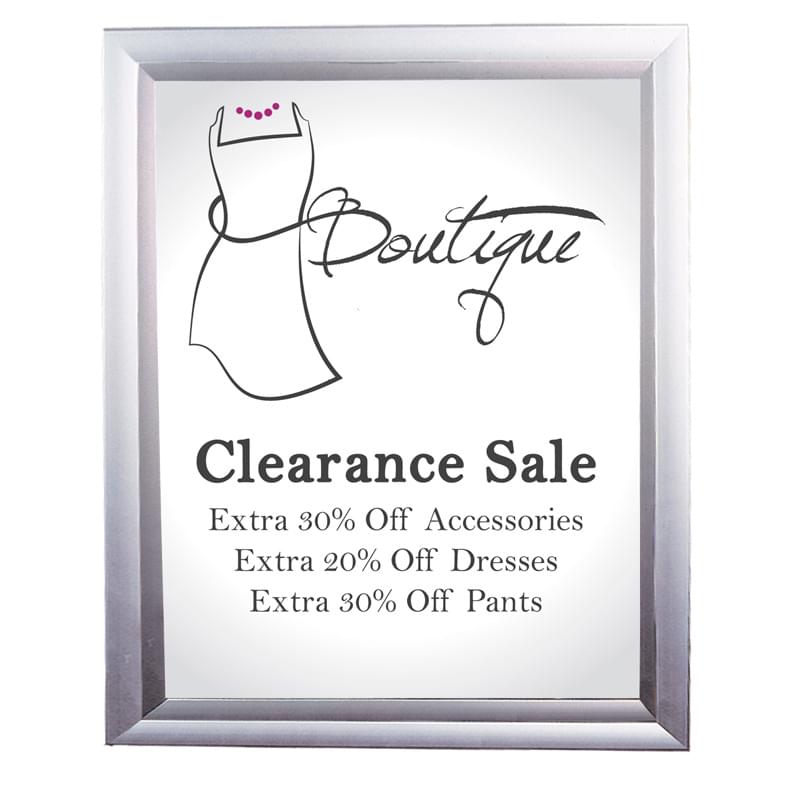 Vertical aluminum frame with concealed top-loading slot allows for fast graphic changes. Clear plastic overlay protects graphic from scratches. Mounting hardware included for easy vertical or horizontal wall mounting. Frames available in silver or black.