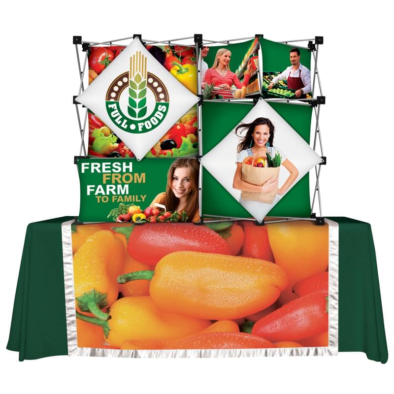 The excitement of three dimensions meets the ease of a pop-up. Interchangeable, dye-sublimated fabric banners create a multitude of looks on one display.Easy and fastest pop-up display to assemble with pre-installed graphic panels Lightweight, weighing more that 50% less than an average floor pop-up display Easy change, fabric panels are machine washable More economical than a standard pop-up display Soft Carry Case included Includes 1 year warranty on frame
